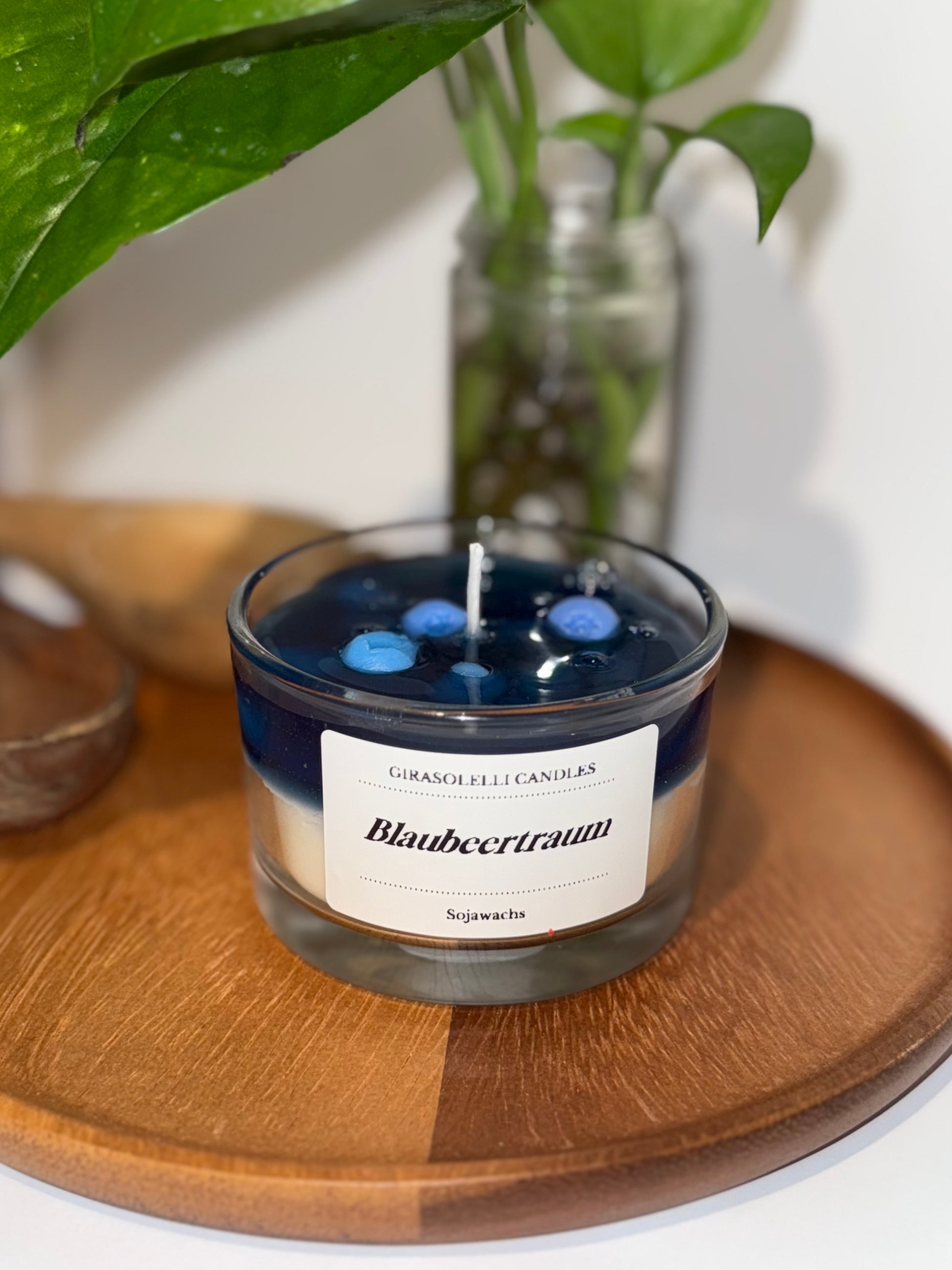 Diese besondere Duftkerze kombiniert cremig-natürliches Sojawachs mit leuchtendem Gelwachs und bildet so einen süßen Blaubeer-Look mit Wow-Effekt. Der Duft? Zarte, warme Vanille, die jedes Zuhause in pure Gemütlichkeit taucht. Handgegossen, dekorativ und fast zu schön, um sie anzuzünden.